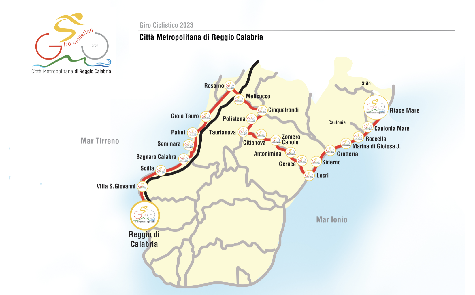 Dallo start di Riace, per l’occasione era presente anche il sindaco Antonio Trifoli, il Giro ciclistico attraverserà i borghi di Caulonia e Roccella per proseguire verso Marina di Gioiosa, Siderno, Locri e giù lungo lo Zomaro con le tappe di Cittanova, Taurianova, Polistena, Cinquefrondi, Melicucco, Rosarno, Gioia Tauro, Palmi, Bagnara, Scilla e Villa San Giovanni. Il traguardo finale sarà fissato sul lungomare monumentale “Italo Falcomatà” nel Comune di Reggio Calabria, rappresentato nell’occasione dalla presenza di diversi Consiglieri delegati.