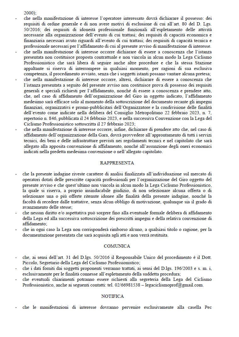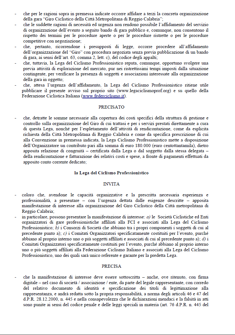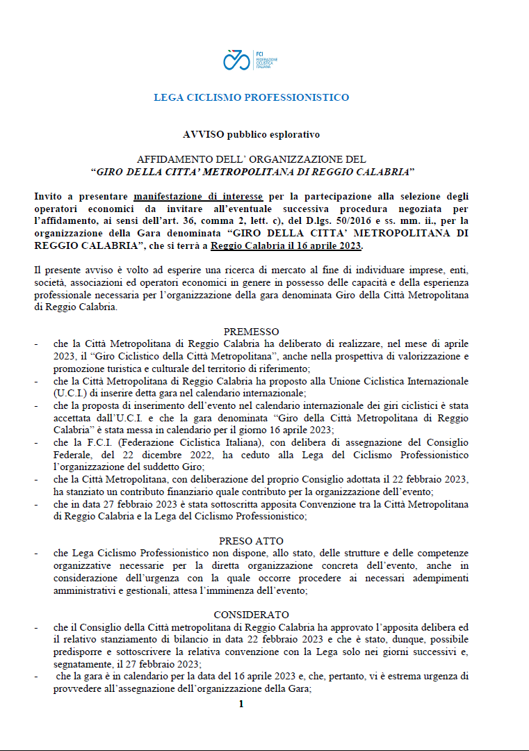AVVISO PUBBLICO esplorativo per l’AFFIDAMENTO DELL’ ORGANIZZAZIONE DEL“GIRO DELLA CITTA’ METROPOLITANA DI REGGIO CALABRIA”